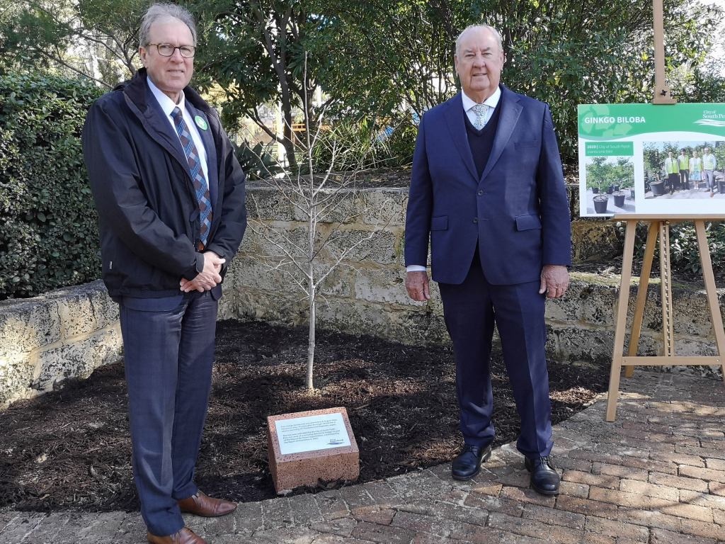 As part of the Mayors for Peace program, City of South Perth mayor Greg Milner and nursery supervisor John Murray planted the sapling, one of six germinated from the seeds.