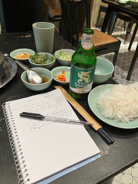 Doing what I hope Annie and my Air BnB guests do, I studied the restaurant recommendations in the in-room guide and looked at the map provided by the welcoming committee. The restaurant I most wanted turned out to be the closest and, erring on the side of caution, headed to Cha Ca Thang Long, a fish restaurant serving a specialty dish. Navigating your way on foot was easy. Dodging the vehicles less so but a certain confidence builds in the solo traveller. You just keep moving and make good decisions. The other road users understand this and work around it.