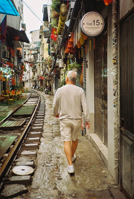 Dexter booked a Grab (Hanoi’s Uber, the company’s green livery is everywhere, even sold to tourists alongside souvenir t-shirts) to Train Street. He showed me a photo of what to look forward to: coffee and snacks served from former homes within touching distance of passing trains. Oh Western Australia, where is your daring? We have cyclone fencing to keep people from crossing our rail tracks anywhere less than the designated points. Apparently here, you reached for the sugar and your fingers brushed the dust and metal of a passing train carriage.