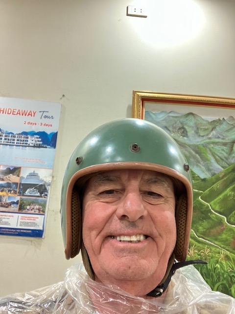 Back to the hotel to await Dexter and I stood outside looking out for our ride. Because the hotel was so close to the lake, traffic shutdowns meant he couldn’t get close enough. Dexter arrived, thrilled with his new jacket and a North Vietnam propaganda poster extolling Uncle Ho exercising every day. So was Uncle Frank. Walking again. This time with our luggage, we headed to the bus office on the same route as to Hidden Gem.