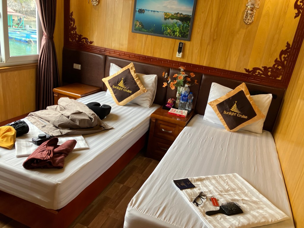 Boarding troubles aside, we stepped onto our vessel and told to leave our bags on deck, unnecessary for Dexter who had his backpack on. Shown to our cabins which had two single beds parallel to the portholes showing off the bay. There was a cupboard for clothes and I was pleased to spot wall lamps above the pillows for easier reading. An ensuite with the shower hugging the porthole side looked good for ventilation but your upper body was available for world view.