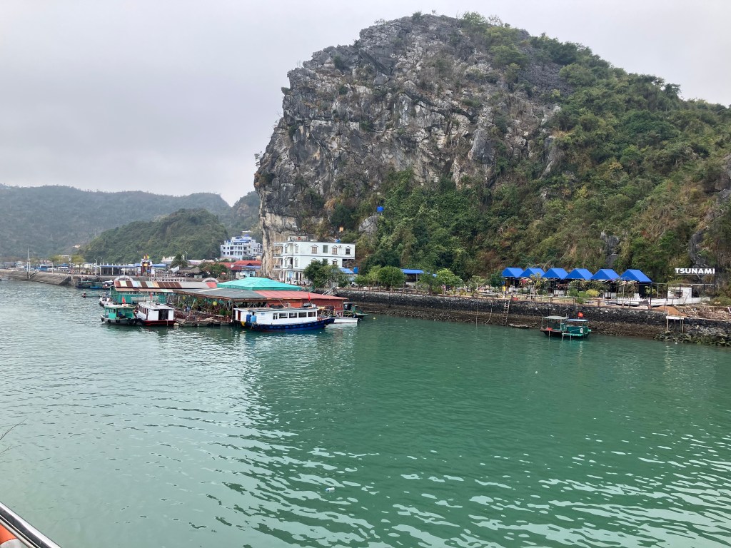 I woke at 6am and Dexter already had his curtain drawn. There was water outside his window and he was awake enough to realise we were on a barge headed for the island and our pick-up. The bus left the barge and a very polite man asked us our destination and said he would give us a 10-minute warning before our drop-off point. No ex-Stasi on this bus. It had been a completely different experience. We were let off at the Cat Ba Sunlight Cruise office.